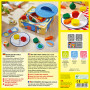 Contenu : 1 marmite avec couvercle (3 éléments), 1 cuillère en bois, 10 légumes en bois (5 paires différentes), 10 plaquettes de légumes, 1 assiette, 1 dé à symboles, 1 règle du jeu.