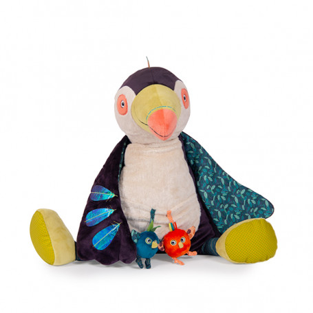 Jeu de textures et de couleurs pour ce grand Toucan d'activités avec du tissu texturé aux pattes, des plumes en tissu holographique, et du papier crissant dans la queue. Cachés dans son ventre, on entend deux petits poussins... cui-cui, pouët !