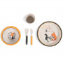 Ce set de vaisselle fabriqué en bambou comprend un bol, une assiette creuse, un gobelet, une fourchette et une cuillère. Il est idéal pour les premiers repas de bébé.