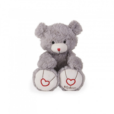 Un doudou ours de 31 cm à la nouvelle fourrure couleur grise, choisie spécialement pour sa douceur exceptionnelle. Ses longs bras et oreilles sont faciles à attraper, et offrent de tendres grands câlins. Sa grande taille lui permet de bien tenir assis pour une présentation optimale dans la chambre de bébé. Un minuscule nez rouge, des petons brodés cœur, un patch Rouge Kaloo et une borderie Kaloo signent chacun des produits de la gamme et permet de les identifier immédiatement.