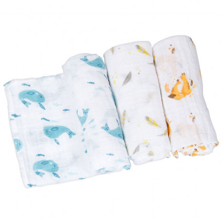 Langes en tissu 100 % coton lavé, de plus en plus doux au fil des lavages, pour tous les moments de douceur avec bébé.