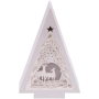 La veilleuse Papercut "Couple de cerf sous les arbres" séduit par son design adorable et ses détails soigneusement mis en valeur. Le motif hivernal est divisé en quatre niveaux différents, ce qui crée un effet 3D fascinant qui est particulièrement bien mis en valeur lorsque l éclairage est allumé. Un couple de cerfs debout dans une clairière pose à la lumière de la pleine lune et une atmosphère se répand grâce à l étoile qui brille en vert au sommet de la pyramide.