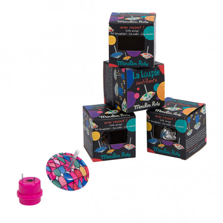 Toupies sautillantes de 4 couleurs différentes (rose, violette, motif aérographe ou multicolore).