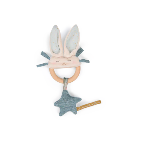 Éveillez la curiosité de bébé avec élégance : le Hochet anneau bois Lapin bleu, un compagnon doux et sonore pour les premières découvertes !