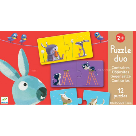 24 grosses pièces en carton solide forment 12 puzzles rigolos et colorés exprimant des contraires : jour/nuit, petit/grand, propre/sale, etc.