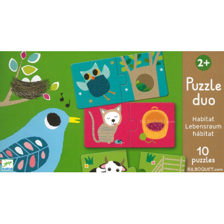 20 grosses pièces pour construire 10 puzzles illustrant les animaux et leur habitat.