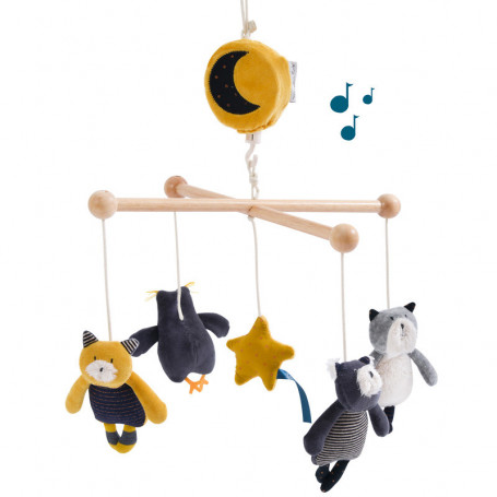 Ce mobile en bois et tissu est équipé d'une boîte à musique qui fait tourner le mobile tout en délivrant une douce mélodie.