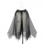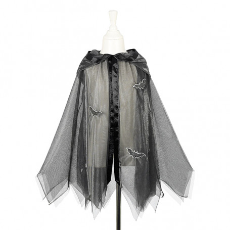 Le manteau Souza a des manches longues avec une bonne largeur. La cape se ferme par un bouton au niveau du cou. Il a une capuche cousue avec un fin liseré noir à l'ouverture. La cape est en tulle.