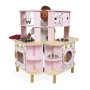 Elle est très bien équipée avec son évier en métal, son robinet en bois et sa plaque à induction sonore et lumineuse. Il suffit d'appuyer une fois sur les boutons rouges pour que les plaques s'allument, puis une deuxième fois pour entendre le son de l'eau qui bout. Le son et la lumière s’éteignent automatiquement au bout de 30 secondes ou lorsqu'on appuie une troisième fois. Pour mettre le four et la machine à laver en marche, rien de plus simple, ils sont chacun équipés de deux boutons rotatifs avec bruitage. Les portes sont magnétiques et la vitre transparente permet de s'assurer que la machine est bien terminée !4 portes coulissantes permettent de ranger les boîtes de gâteaux et autres friandises. À l'intérieur de la cuisine, 2 placards supplémentaires permettent de ranger les ustensiles et autres accessoires.