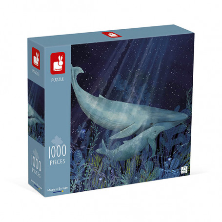 How peaceful is life under the sea? Would you too like to experience the serenity of the seabed? Take a seat in your most comfortable armchair and find calm and pleasure at the side of this mother whale and her calf, cradled by the fresh currents, caressed by the dancing seaweed and illuminated by a gentle ray of light... This magnificent illustration in deep blue tones is to be discovered step by step by putting together a puzzle that will require concentration and dexterity. Take the opportunity to share a moment with your family and combine your logic to reveal this beautiful scene, an ode to nature.