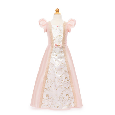 This stunning dress fit for a princess is made from a pink and cream fabric with elegant short sleeves and topped with a layer of gold embroidery.